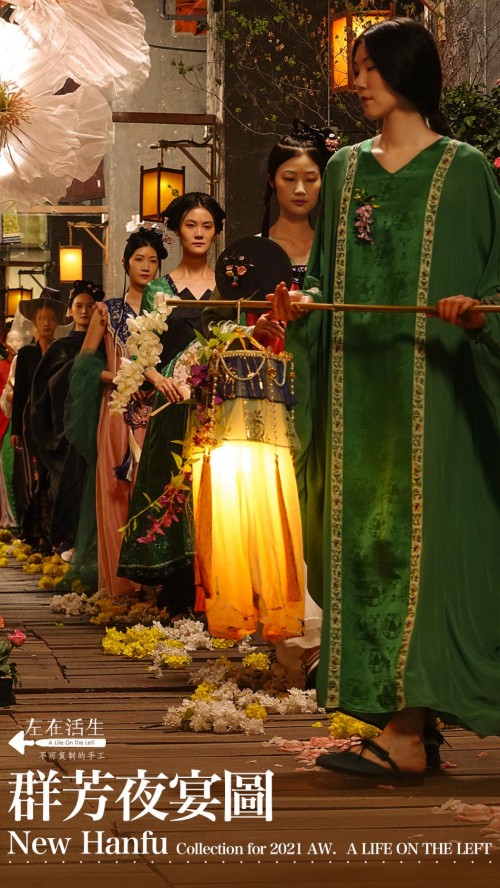 值得一提的是,本场发布会以传统曲裾服作为始末,首尾呼应,突出了生活在左一直以来所打造的NEW HANFU系列。曲裾,续衽钩边,繁复典雅,生活在左提取其环绕而延续的特点,以曲裾服进行点题,精致的牡丹花与狮子滚绣球纹样,进一步突显出夜宴之芳。